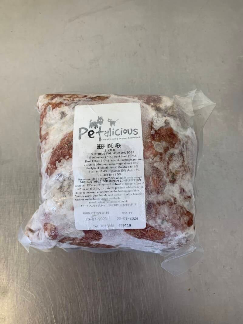 Petalicious RAW Beef with added vegetables is produced using only fresh British vegetables and beef including the beef offal and bones.