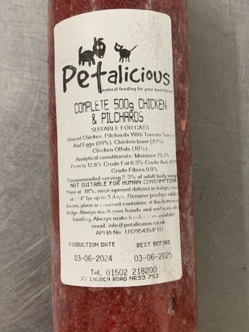Petalicious Raw Chicken and pilchards is made from fresh UK chickens, eggs and pilchards in tomato sauce and frozen to lock in vitamins and nutrients naturally contained.