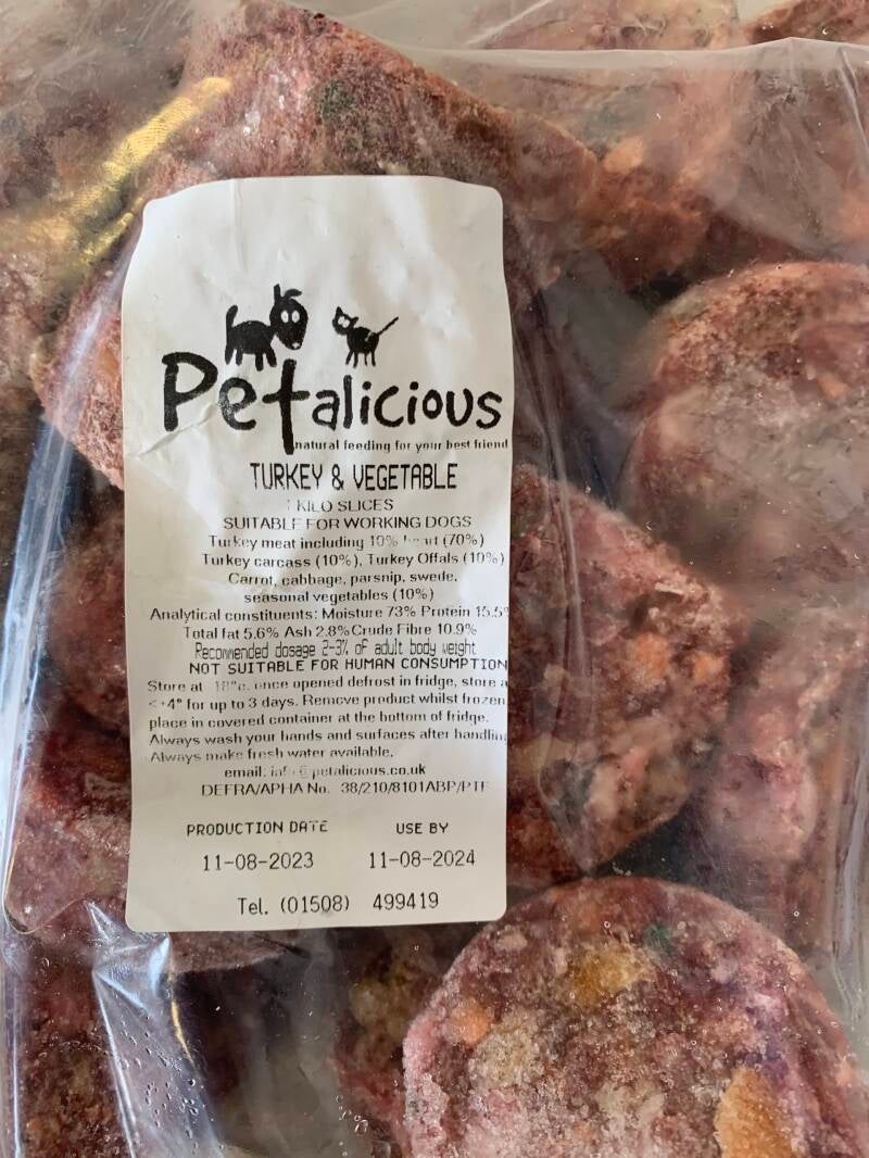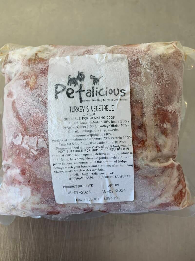 Petalicious RAW Turkey with added Vegetables is a nutritionally balanced meal for your pets, made from fresh British Turkey, vegetables, offal and bone.